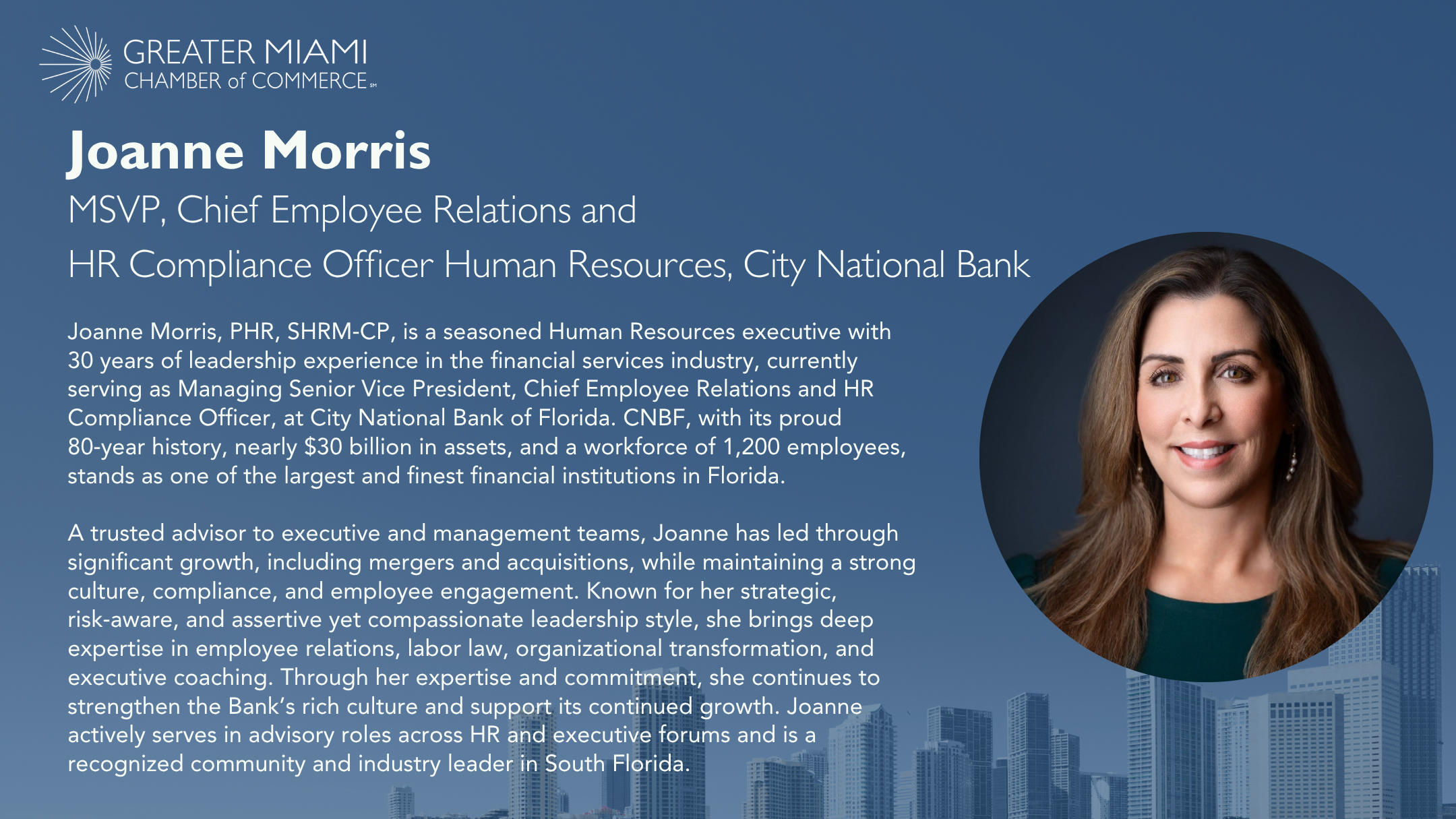 Tammy received her Bachelor of Arts at Florida State University. Her professional and community volunteer affiliations are many. She has served as the Chairperson for HR Insights and Workforce Committee of the Miami Chamber of Commerce and currently, a Director at Large. She has served as a Board Member for the Greater Miami Society for Human Resource Management, participation with United Way of Dade County, Daily Food Bank of Dade County, “Race for the Cure” Miami, Florida. She has served on several community development boards and is a recognized leader in South Florida.