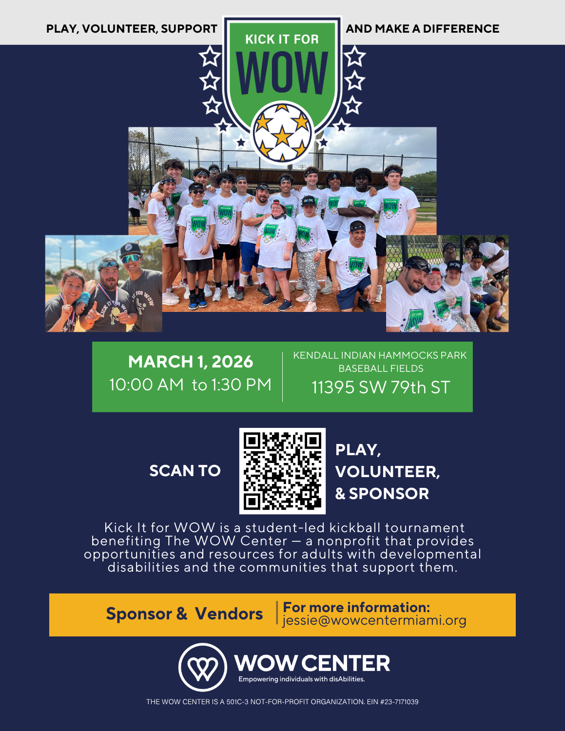 Kick It for WOW is a student-led kickball tournament supporting The WOW Center, a nonprofit empowering adults with developmental disabilities. Join the community on March 1, 2026, from 10:00 AM–1:30 PM at Kendall Indian Hammocks Park Baseball Fields to play, volunteer, or sponsor. All proceeds help fund inclusive programs and meaningful opportunities.
